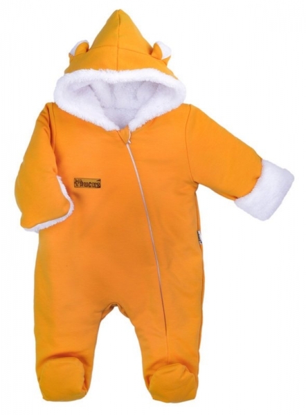 Oteplený kojenecký overal/kombinéza s kapucí, Big Trucks, hořčicový; 68 (3-6m)