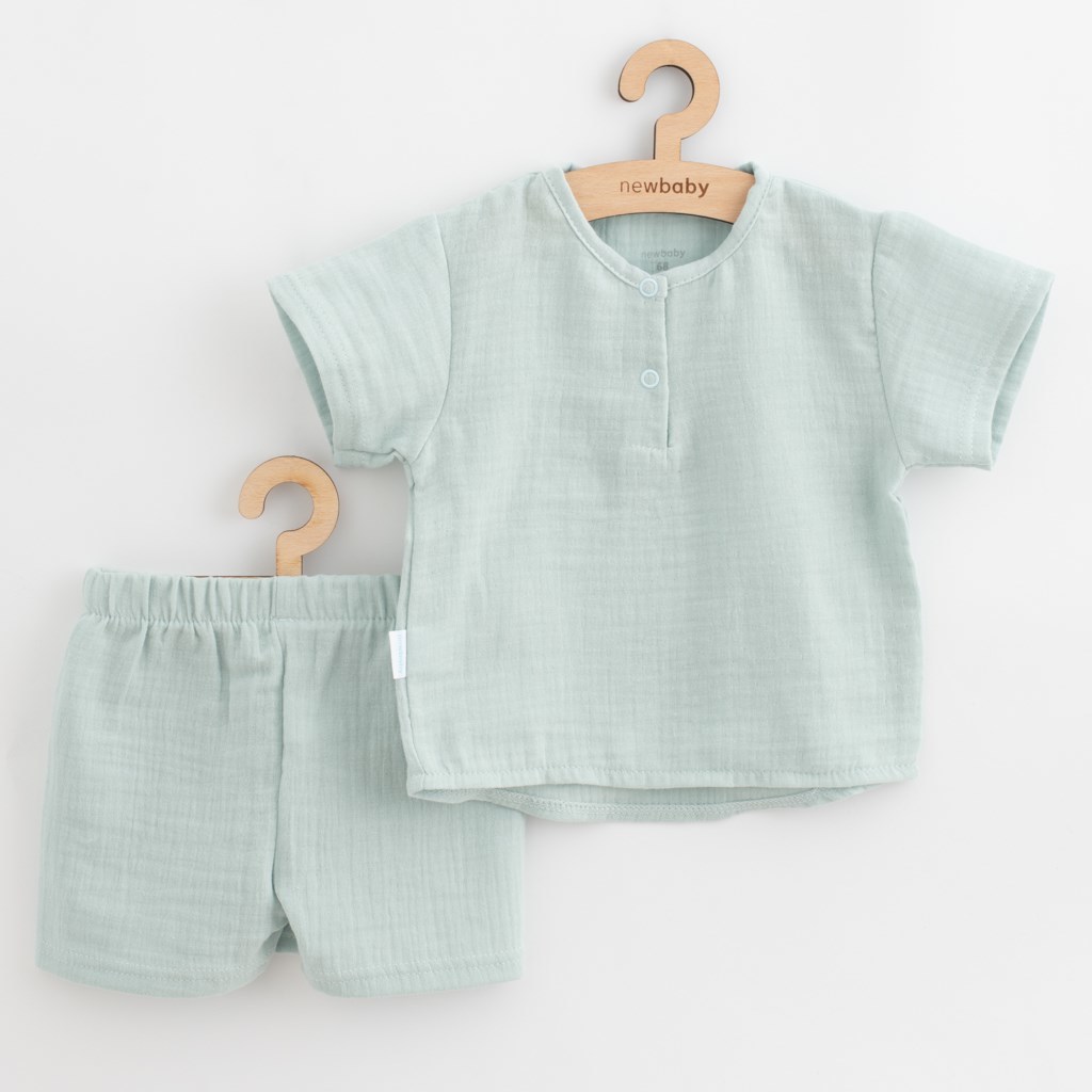 Praktická letní 2-dílná mušelínová kojenecká soupravička české značky New Baby Soft dress pro chlapečky. Letní soupravička se skládá z trička a kraťasů. Tričko má krátký rukáv a dokonalý střih. Zapínáni pod krkem na cvočky. Kraťasy mají v pase širší gumu, která ale netlačí na bříško dítěte....