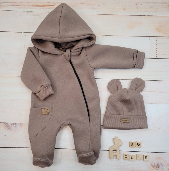 Oteplený dětský overal se šlapkama a kapucí + čepička, 2D, Kazum, čokoládový; 56 (1-2m)