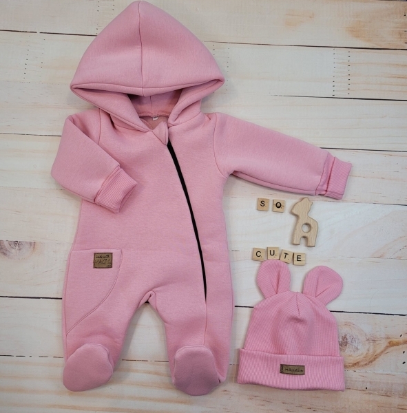 Oteplený dětský overal se šlapkama a kapucí + čepička, 2D, Kazum, růžový, vel. 62; 62 (2-3m)