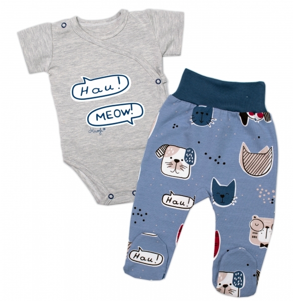 Body kr. rukáv zap. bokem + polodupačky Pejsek a Kočička Mrofi, šedá/modrá, vel. 62