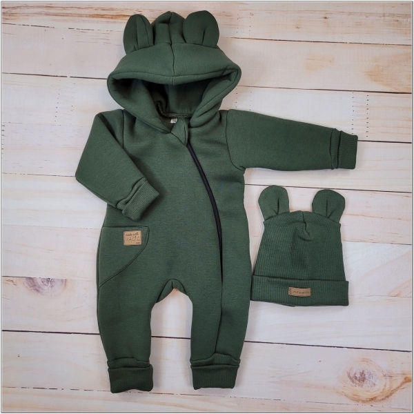 Oteplený dětský overal bez šlapek s kapucí + čepička, 2D, khaki, vel. 68; 68 (3-6m)