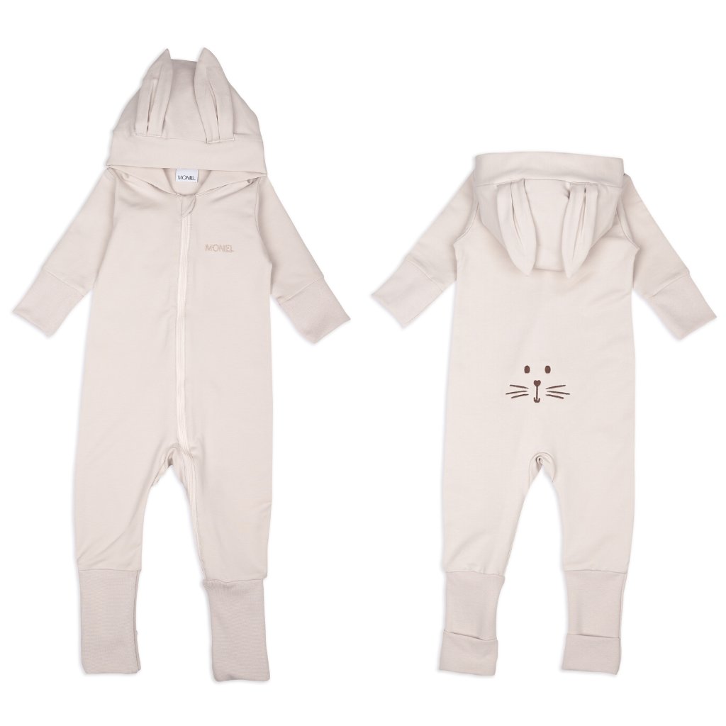 Dětský teplákový rostoucí overal na zip s kapucí Moniel Králík Basic Light Beige je praktický a funkční. Díky rostoucím nápletům roste s vaším děťátkem. Můžete si vybrat, zda bude mít dítě nožičky venku nebo zakryté v overalu. Ručně šitý v ČR. Velikosti od narození až do 4 let. Overal má kapuci s oušky. Barva světlá perlově béžová.