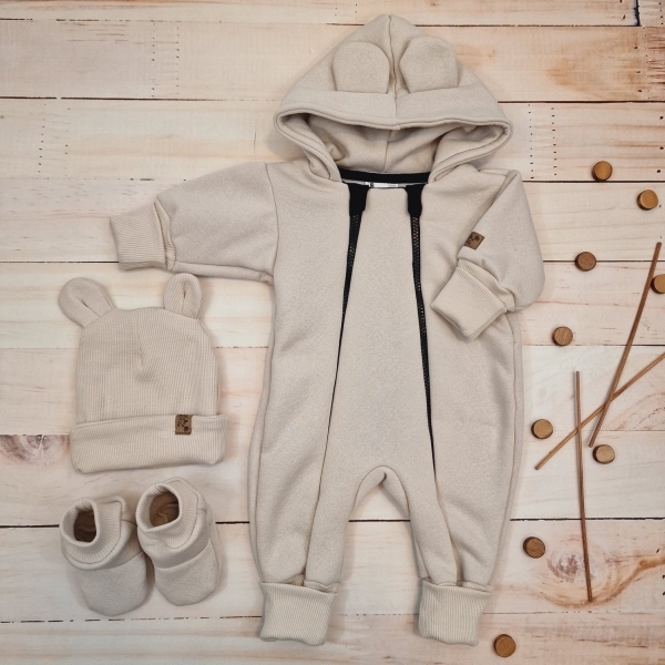 Oteplený dětský overal bez šlapek s kapucí, čepička + botičky, 3D, Kazum, béžový, vel. 74; 74 (6-9m)