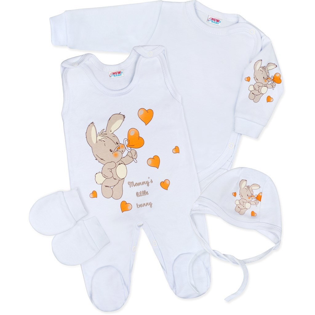Krásná bavlněná kojenecká 4-dílná soupravička New Baby. Soupravička obsahuje čepičku se zavazování na tkaničky, body s dlouhým rukávem s bočním zapínáním, dupačky a rukavičky. Čepička, body a dupačky mají natištěný veselý obrázek. Barvy použité k potisku jsou certifikované a vhodné pro miminka....