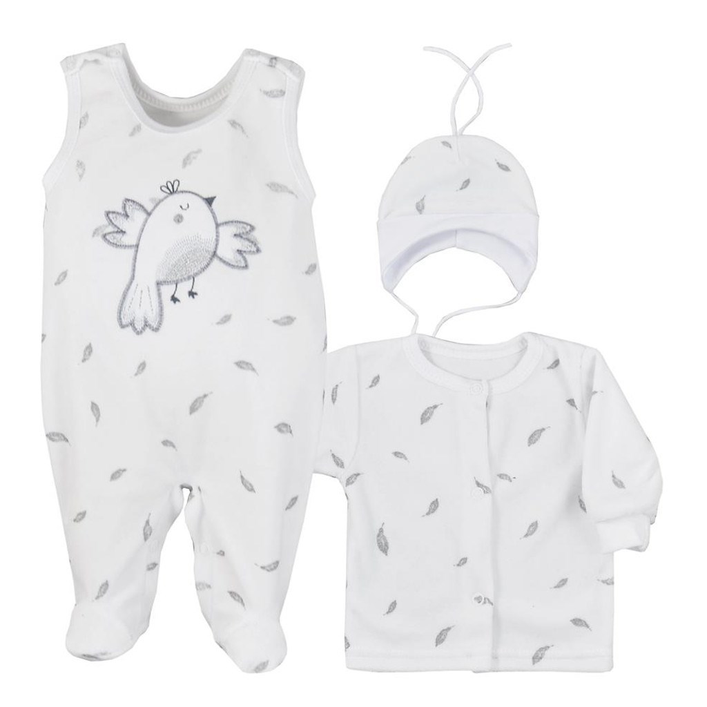 3-dílná semišková soupravička Koala Pírka. Soupravička obsahuje čepičku se zavazováním na tkaničky, kabátek, dupačky a je vhodná pro miminka už od narození pro svou jemnost a měkkost. Čepička, dupačky a kabátek jsou celopotištěné moderními pírky. Dupačky zdobí roztomilý ptáček. Zapínání mají na...