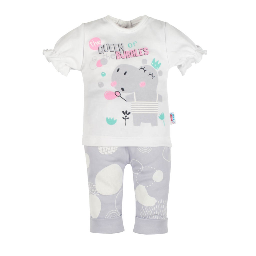 Krásná a veselá letní 2-dílná bavlněná soupravička české značky New Baby Queen. Holčičí soupravička obsahuje tričko a tepláčky. Tričko je zdobeno veselým obrázkem hrošíka a nápisem the Queen of Bubbles s krátkým nařaseným rukávkem s jemnou gumičkou. Tričko má zapínání na zadní straně na cvoček....