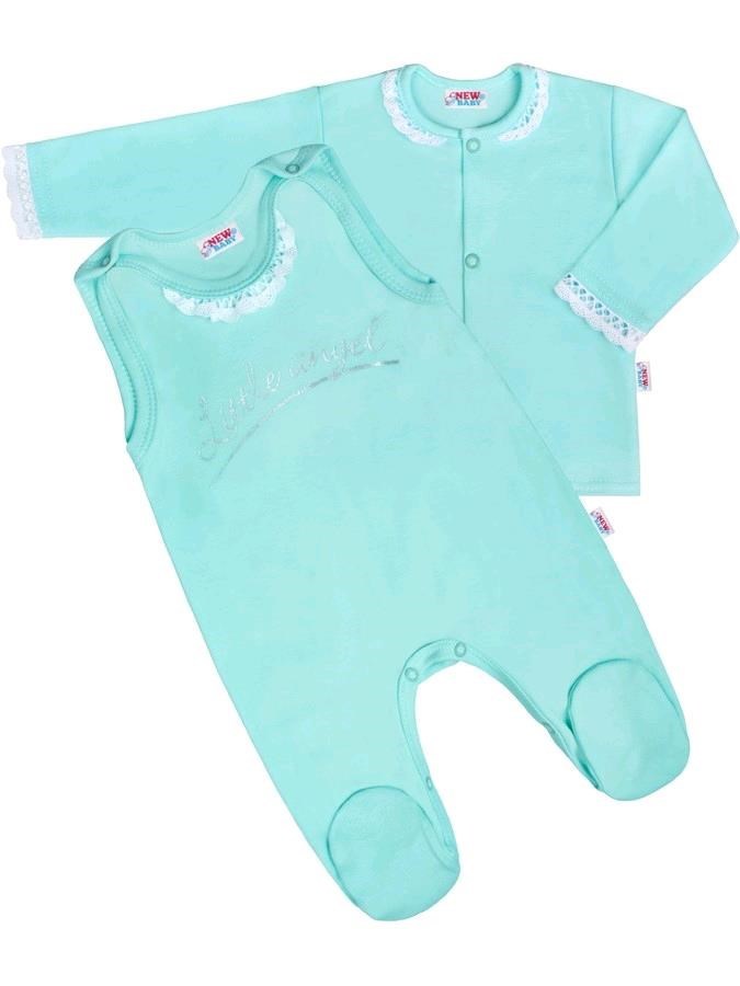 2-dílná soupravička New Baby Angel pro miminka. Dětská soupravička obsahuje dupačky a kabátek. Dětský kabátek je jednobarevný, zdobí ho krásný ozdobný lem kolem krčku a ručiček. Praktické zapínání na cvočky po celé délce velmi usnadní oblékání a přebalování. Dupačky zdobí nápis Little angel,...