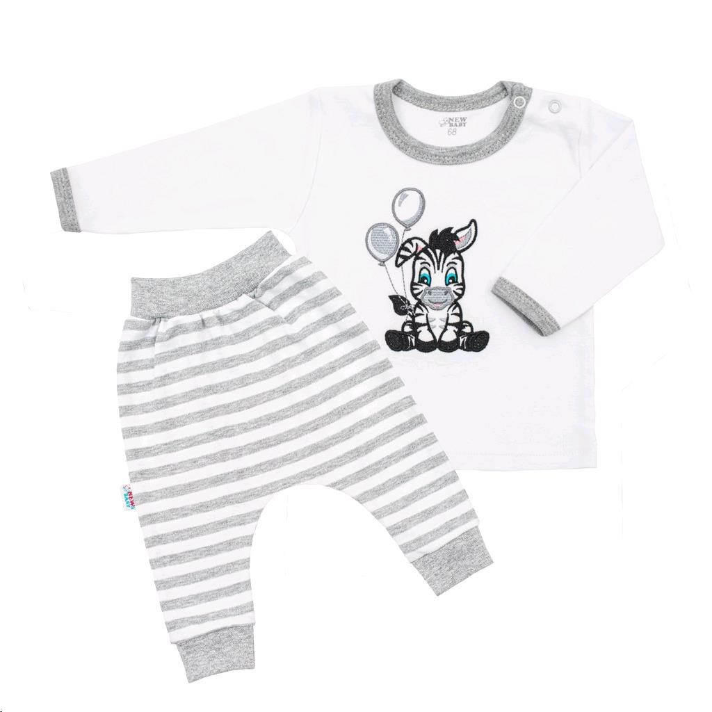 2-dílná kojenecká soupravička české značky New Baby Zebra exclusive pro miminka. Soupravička se skládá z trička a tepláčků. Tričko je jednobarevné s vyšitým obrázkem roztomilé zebry. Obrázek je z vnitřní strany podlepený podšívkou proti poškrábání. Okolo krčku, ručiček a pasu má šedý lem. Zapínání na cvočky na ramínku. Tepláčky jsou zdobeny moderními pruhy. V pase a na nohavičkách mají širší pružný lem. Složení: 100% bavlna.