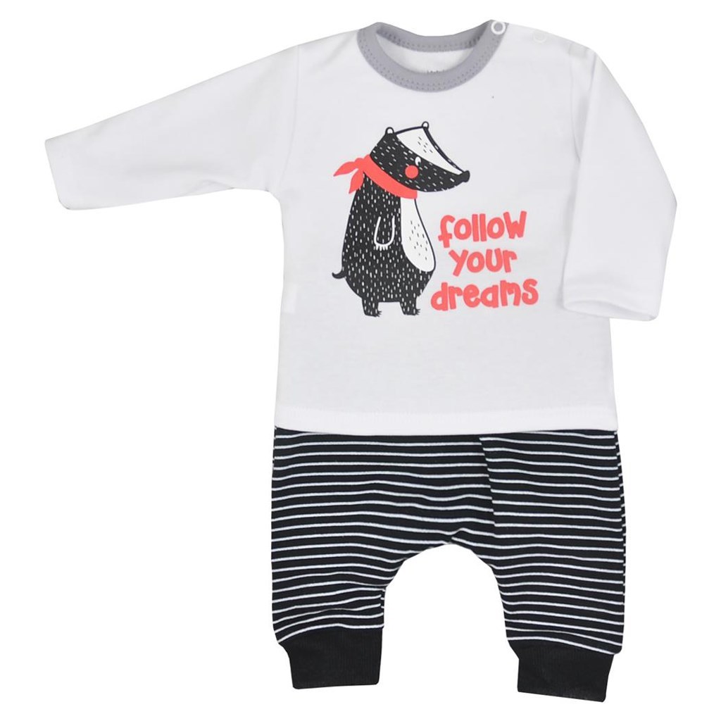 2-dílná bavlněná souprava Koala Jezevec. Součástí soupravičky jsou tepláčky a tričko. Tepláčky mají moderní střih se sníženým sedem. Jsou zdobeny stále moderními pruhy a jsou ukončeny širokým lemem. Tričko je zdobeno obrázkem krásného zasněného jezevce a nápisem. Praktické zapínání na cvočky na ramínku. Materiál: 100% bavlna.