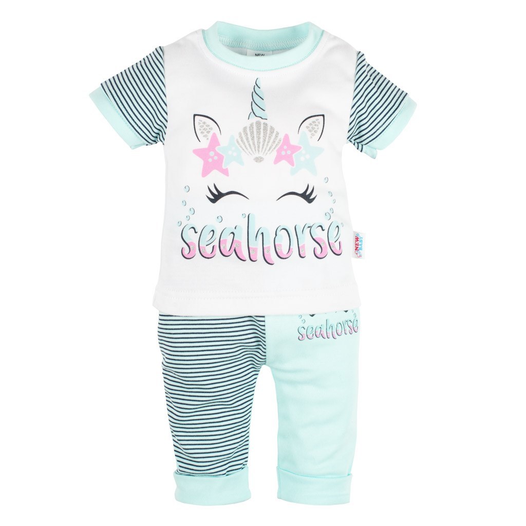 2-dílná bavlněná soupravička české značky New Baby seahorse. Soupravička obsahuje tričko a tepláčky. Tričko s krátkým rukávem s módnim prožkovaným potiskem je zdobeno veselým obrázkem a nápisem seahorse. Tričko je bez zapínání a na krčku má pružný lem pro snadné oblékání. Tepláčky zdobí obrázek s nápisem seahorse a stále moderní prožky. V pase mají širší gumičku a nohavičky jsou ukončené manžetkami. Soupravička má všestranné využití. Složení 100% bavlna.