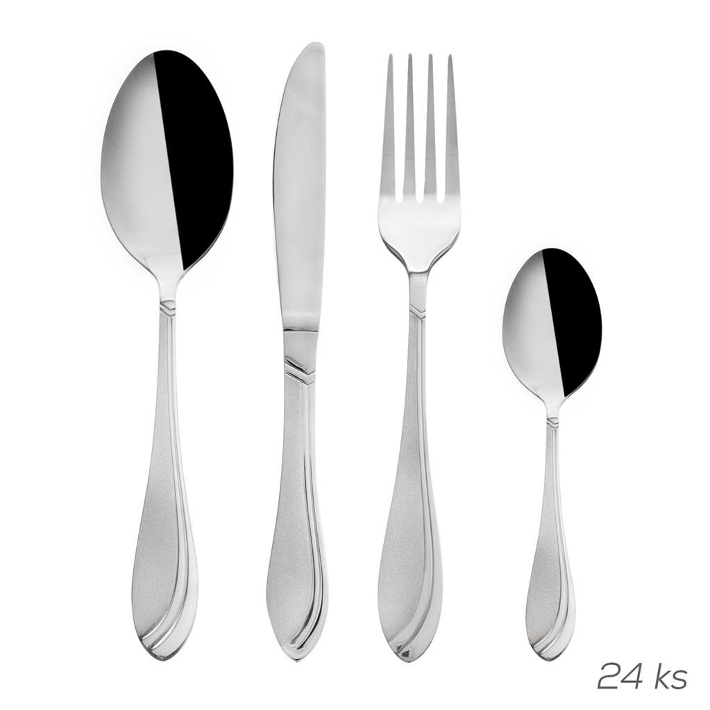 Sada příborů s protlačovaným vzorem pro všední i sváteční stolování. Sada obsahuje: 6x lžíce (d. 20 cm), 6x vidlička (d. 21 cm), 6x nůž (d. 22,5 cm) a 6x čajová lžička (d. 14,5 cm). Materiál: kvalitní nerez. Sada 24 ks. Příbory lze mýt v myčce na nádobí, ale pokud chcete zachovat jejich lesklý a neporušený povrch, pak to vzhledem k působení čistících prostředků nedoporučujeme.
