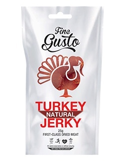 Sušené maso krůtí – jemně zauzené. Tepelně opracovaný masný výrobek – trvanlivý.