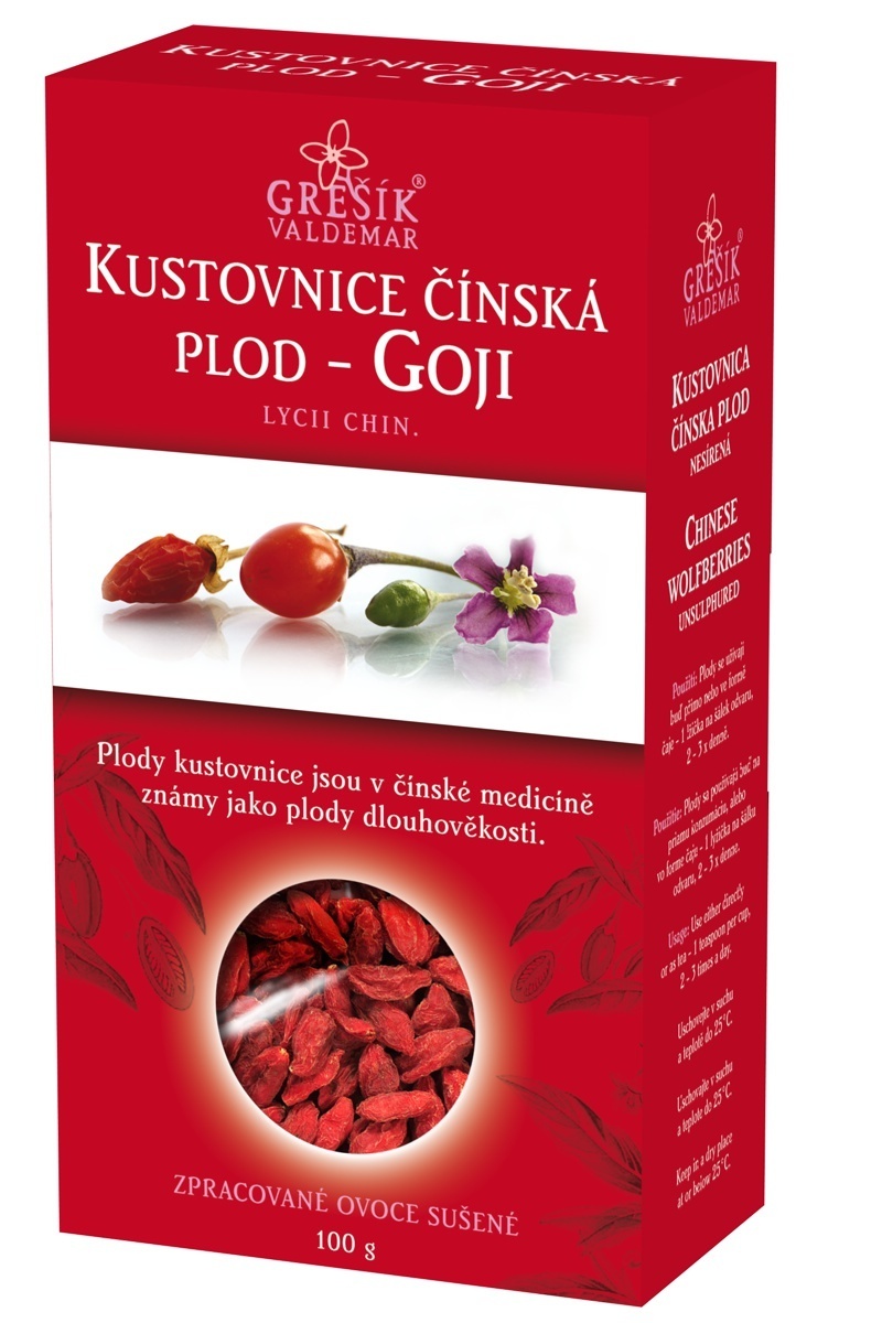 Kustovnice čínská plod - GOJINesířenáPlody kustovnice jsou v čínské medicíně známy jako plody dlouhověkosti.Použití: Plody se užívají buď přímo nebo ve formě čaje - 1 lžička na šálek odvaru, 2 - 3 x denně.Průměrné výživové hodnoty ve 100 g:Energetická hodnota: 1500 kJ/359 kcal; Tuky: 1,1 g, z...