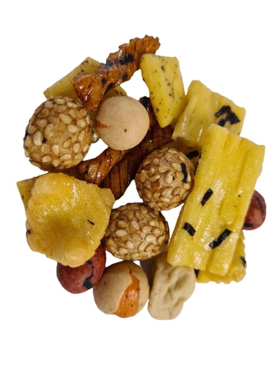 Originálne zloženie zahŕňa mimo iného kukuričný škrob, arašidy, pšeničnú múku a sezamové semienka, ktoré spolu tvoria základ tejto lahodnej zmesi. Pridaná sójová omáčka a korenový extrakt z červenej papriky potom podčiarkujú autentickú chuť, ktorú len tak nenájdete.