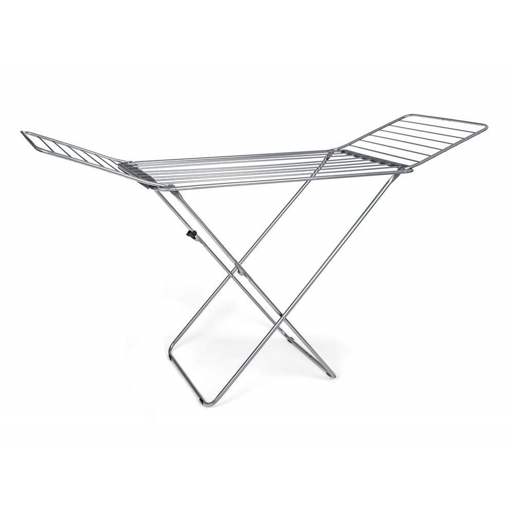 Stabilní přenosný sušák na prádlo nabízí cca 20 metrů sušící plochy, což představuje až dvě plné pračky prádla. Boční křídla jsou vhodná na sušení delšího prádla. Praktickým pomocníkem je držák na sušení ponožek. Velkou výhodou je stabilní konstrukce ze stříbrných trubek, doplněných plastovými držáky v šedé barvě. Bezpečnému použití napomáhá také dětský bezpečnostní zámek, omezující možnost nechtěného složení a případného pádu.