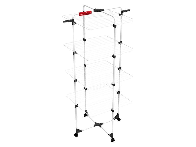 Ocelový čtyřúrovňový sušák na prádlo, velmi všestranný a flexibilní. Díky nezávislým roštům, které mohou být použity otevřeně pro např. sušení dlouhých oděvů, nebo polosloženě a přisunuté např. u radiátoru, skvěle šetří místo. Dodatečné sušící místo lze získat použitím držáku pro malé oděvy, jako jsou ponožky nebo spodní prádlo. Lze využít též 2 věšáky pro ramínka. Otočná kolečka pro snadné přemisťování. Lze kompaktně složit a skladovat. Díky speciálnímu kloubu lze využívat polovinu nebo plnou plochu sušáku. I při minimálních nárocích na prostor nabízí 40 metrů sušící plochy. Má 8 nezávislých roštů vhodných pro sušení dlouhých oděvů nebo delikátního prádla a s držákem pro malé oděvy, 2 věšáky pro ramínka a otočnými kolečky pro snadné přemisťování.