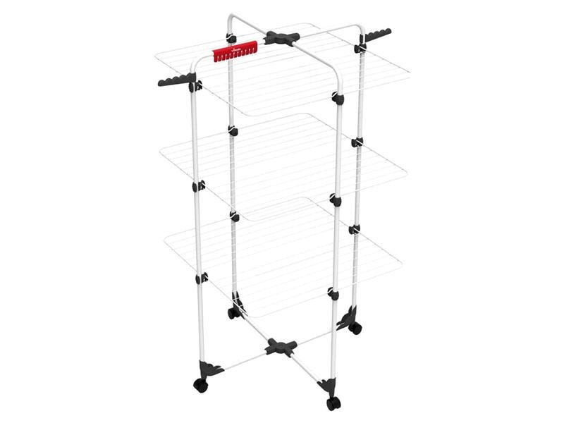 Ocelový tříúrovňový sušák na prádlo, velmi všestranný a flexibilní. Díky nezávislým roštům, kteté mohou být použity otevřeně pro např. sušení dlouhých oděvů, nebo polosloženě a přisunuté např. u radiátoru, skvěle šetří místo. Dodatečné sušící místo lze získat použitím držáku pro malé oděvy, jako jsou ponožky nebo spodní prádlo. Lze využét též 2 věšáky pro ramínka. Otočná kolečka pro snadné přemsťování. Lze kompaktně složit a skladovat. Díky speciálnímu kloubu lze využívat polovinu nebo plnou plochu sušáku. I při minimálních nárocích na prostor nabízí 30 metrů sušící plochy. Má 8 nezávislých roštů vhodných pro sušení dlouhých oděvů nebo delikátního prádla a s držákem pro malé oděvy, 2 věšáky pro ramínka a otočnými kolečky pro snadné přemisťování.