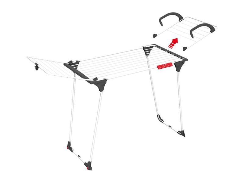 Sušák 2v1, který lze použít jako celek k běžnému sušení prádla, nebo odejmout křídlo, které lze využít jako závěsný sušák za radiátor nebo balkón. Odnímatelné křídlo je vybaveno extra pevnými a odolnými rameny, která vám poskytnou stabilitu a pevnost. Díky celkové sušící ploše 18 metrů vám sušák poskytne dostatek prostoru pro usušení jedné až dvou praček prádla. Silné hliníkové dráty zabraňují nadměrnému zmačkání prádla a tím zkracují dobu žehlení. Ocelové nohy poskytují dostatečnou stabilitu a pevnost, navíc jsou vybaveny speciálním zámkem, zabraňujícím jakémukoli náhodnému uzavření. Dodatečný prostor pro sušení drobného prádla poskytuje přídatný držák drobných oděvů. Lze pohodlně uzavřít a skladovat vodorovně.