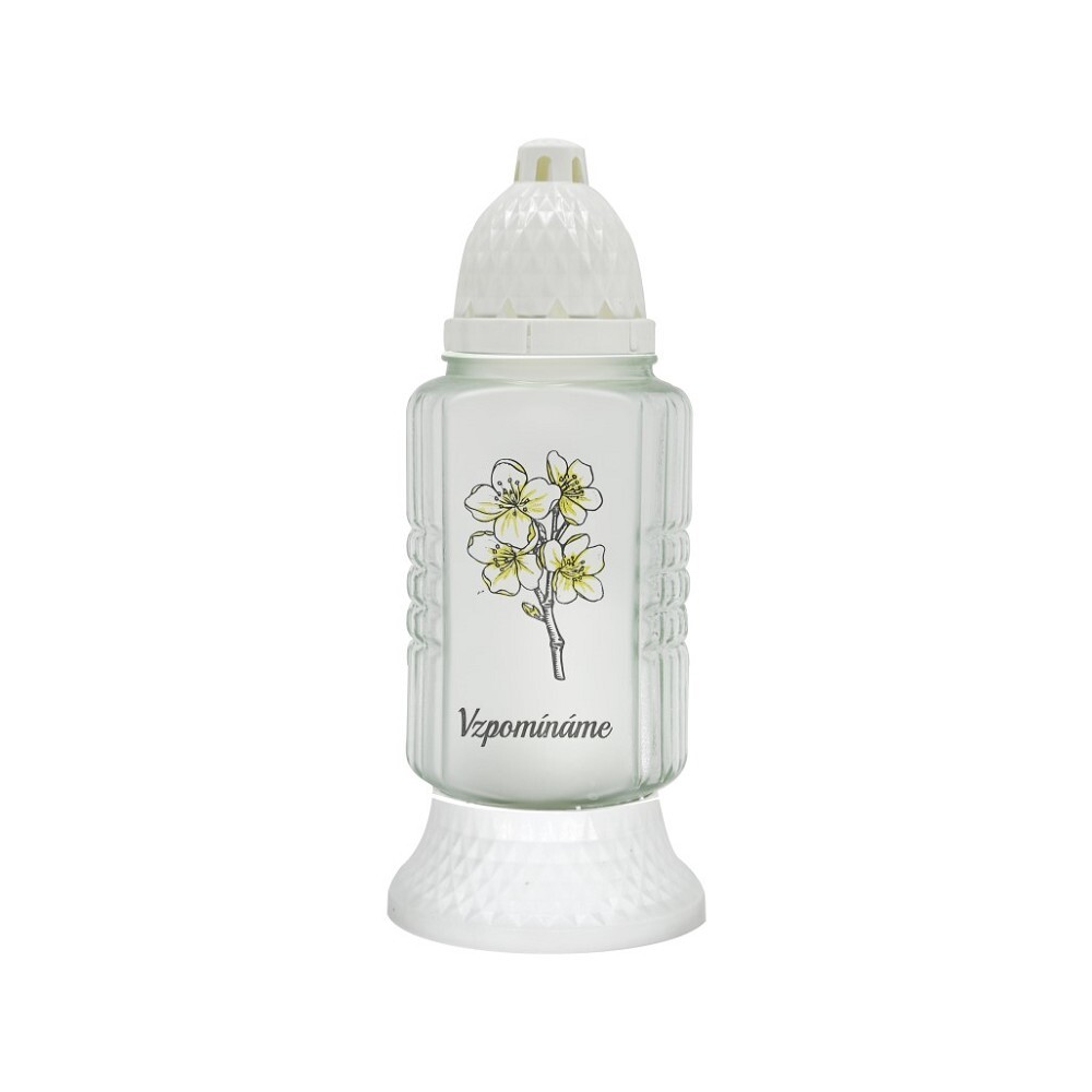 Důstojná skleněná hřbitovní svíčka s jemným motivem květin přináší tichou vzpomínku a úctu k památce zesnulých. Svíčka má výšku 27 cm, což zajišťuje stabilitu a výraznost na pietním místě. Parafínový vklad o hmotnosti 80 g poskytuje přibližně 24 hodin hoření. Víčko chrání plamen před nepřízní počasí. Vhodná pro celoroční použití na hřbitově nebo pamětním místě.
