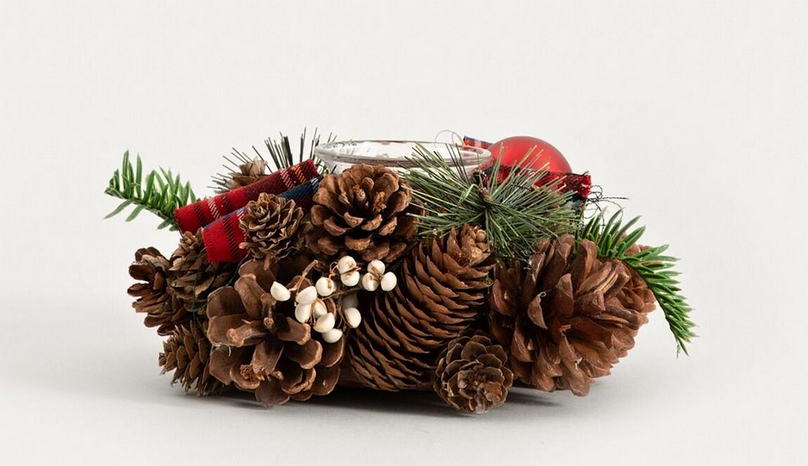 Skvělá volba pro vánoční dárek. - Zdobeno šiškami, větvičkami, červenými ozdobami a stužkou. - Elegantní dekorace na stůl s prostorem pro svíčku. - Vyrobeno z odolného plastu a pěny.Vánoční svícen 17 × 14 cmSvícen HUGO je jedinečná dekorace, která do vašeho domova vnáší sváteční náladu. Je...