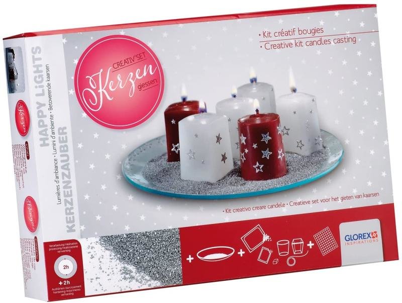 Táto kompletná hobby sada obsahuje všetky potrebné komponenty na výrobu a zdobenie sviečok. Granule vosku a červené farbivo do vosku umožnia vytvoriť sviečky v krásnej vianočnej červenej farbe. Súčasťou sú aj knôt na sviečky, dve formy (okrúhla aj štvorcová) pre originálne tvary sviečok, strieborné nálepky na dekoráciu a okrúhly sklenený podnos ako štýlové podloženie. Pre dokonalý zimný dojem pridajte trblietavý strieborný dekoračný piesok.