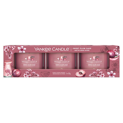 Zakončete den se skleničkou saké v ruce. Okouzlí vás delikátní vůní sladké švestky a lákavou kombinací malin a rýžového vína.Plněné votivní svíčky ve skle jsou skvělým způsobem, jak si užít vaší oblíbenou vůni. Provoní interiér až na 3 x 10 hodin. Svíčky jsou vyrobeny z hladké směsi sojového vosku a skleničky z kvalitního skla, které můžete po vypálení použít jako svícínky pro čajovou svíčku.Tato sada v dekorativní krabičce vám poslouží jako krásný dárek.Rozměr krabičky: 17,5 x 6 x 4,5 cm.Jedna svíčka: váha 37 g, rozměr 5,5 x 4 cm.