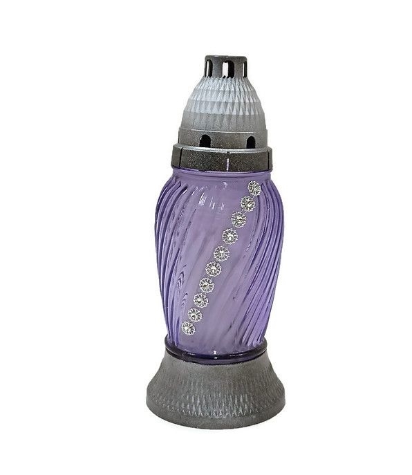 Skleněná hřbitovní svíčka s vyměnitelnou parafínovou náplní 40g, s plastovým spodkem, zajišťujícím dobrou stabilitu skla a plastovým vrškem, který chrání plamen před zhasnutím vlivem větru a deště.