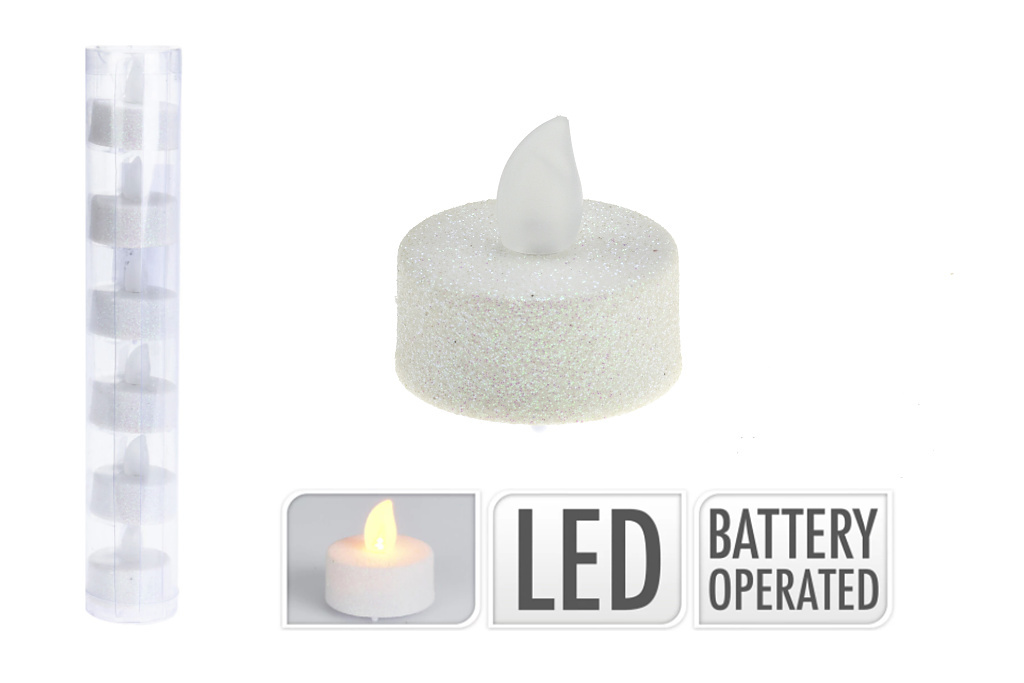 Umělá svíčka s LED osvětlením imitující mihotání plamene v lehkém poryvu větru. Svíčka je o přibližné velikosti standardní čajové svíčky. Napájena je 1 x CR2032 baterií - každá svíčka má vloženou baterii, která je součástí balení. Svíčky jsou bílé barvy se třpytivými griltry.