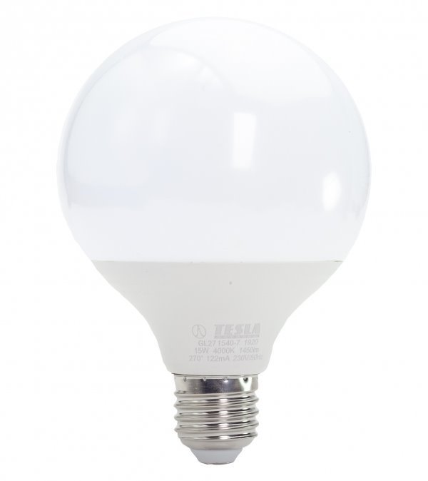 TESLA GLOBE E27 15WLED žárovka pro patici E27 ušetří energie a plně nahradí klasické žárovky.ZÁKLADNÍ SPECIFIKACEPatice: E27Příkon: 15 WSvětelný tok: 1450 lmBarva světla: denní bíláBarevná teplota: 4000 KMinimální životnost: 25000 hodinVstupní napětí: AC 230 VÚhel světelného paprsku:...