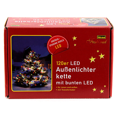 Multifunkční LED světelný řetěz se 120 barevnými žárovičkami pro interiérové i venkovní použití. Zelený kabel s transformátorem (24V venkovní použití, 230V interiérové). Parametry: počet LED diod: 120, barvy světla: bílá, modrá, zelená, červená a žlutá, vzdálenost žárovek: 10cm, celková délka...