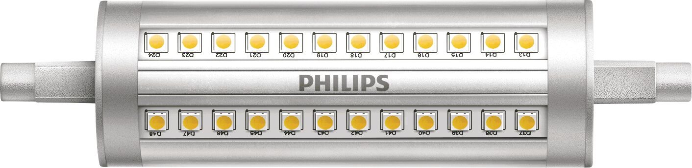 stmívatelný LED lineární světelný zdroj Philips CorePro LEDlinear MV v délce 118 mm je určen pro svítidla se dvěma paticemi R7S standardní síťové napětí AC 220 V - 240 V příkon 1 x 14 W nahrazuje klasickou halogenovou lineární žárovku se dvěma paticemi R7S o příkonu 120 W silný světelný tok 2000...