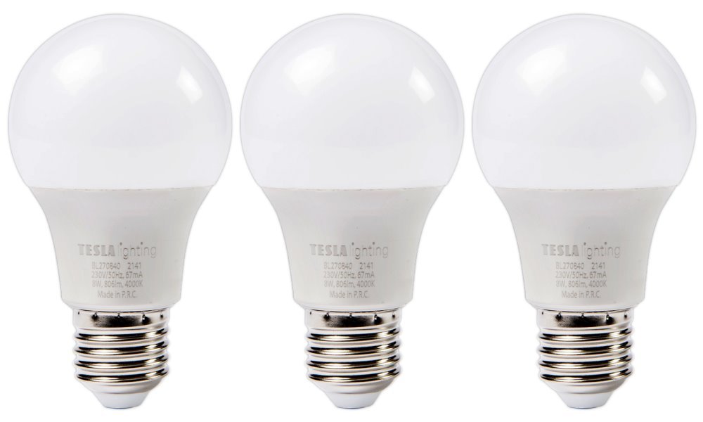 TESLA BULB E27 8 W 3 ksLED žárovka pro patici E27 ušetří energie a plně nahradí klasické žárovky.Balení obsahuje 3 ks LED žárovek.ZÁKLADNÍ SPECIFIKACEPatice: E27Příkon: 8 WSvětelný tok: 806 lmBarva světla: denní bíláBarevná teplota: 4 000 KMinimální životnost: 25 000 hodinVstupní napětí: AC 230...