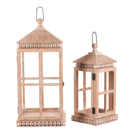Dodejte svému interiéru nádech venkovského kouzla s touto dřevěnou lucernou v přírodní světle hnědé barvě. Čtyřboký design s velkými čirými skly nechá vyniknout světlu svíčky, ať už lucernu pověsíte, nebo postavíte na stůl či polici. Sada dvou různých velikostí nabízí variabilitu a skvěle se hodí k vytvoření harmonického světelného aranžmá, které zútulní každý kout domova.