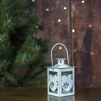 Táto elegantná lucerna v bielom prevedení je zdobená srdiečkami, ktoré tvoria príjemný dekoratívny prvok aj keď práve nie je zapálená sviečka. Jej kompaktné rozmery (7,2 x 7,2 cm, výška 11 cm) umožňujú ľahké umiestnenie na rôzne miesta - na parapet, stôl či poličku. Je vyrobená z kvalitného kovu a skla, ktoré zabezpečujú odolnosť aj stabilitu pri používaní.