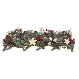 Krásný adventní svícen na 4 svíčky. Rozměry : 40 x 14 cm, výška 8,5 cm. Barva : kombinace přírodní, hnědá, zelená, bílá, červená. Materiál : přírodní, sklo, plast. prečítať celé