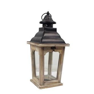 Tato lucerna je vyrobena ze dřeva a skleněných panelů, horní část je z kovu.