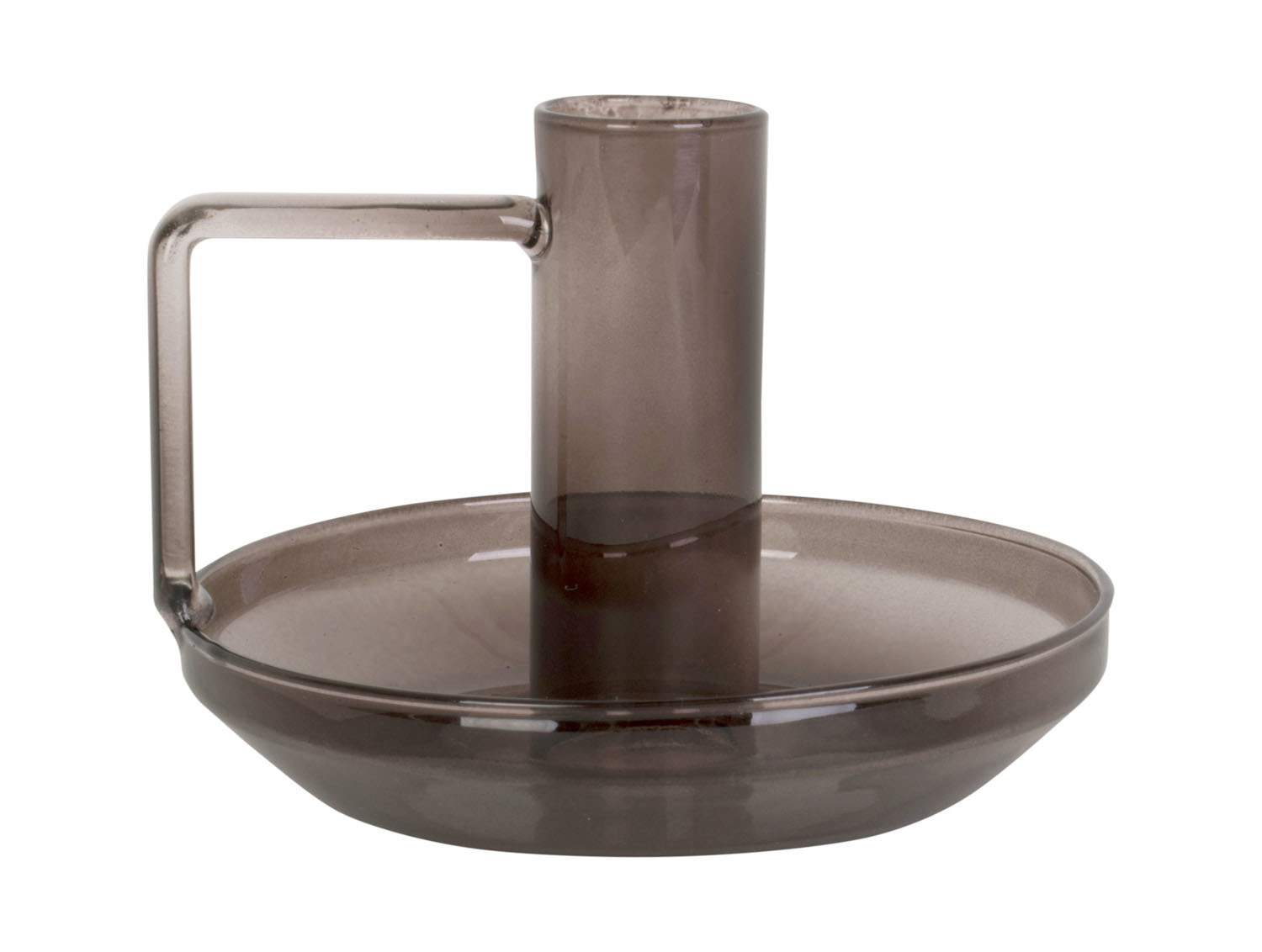Skleněný svícen s uchem v čokoládově hnědé barvě.