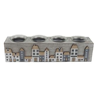 Dekorační svícen na 4 svíčky.Rozměry : 31 × 7 cm, výška 8 cm.Narva : kombinace hnědá, bílá, šedá.Materiál na bázi dřeva, sklo. prečítať celé