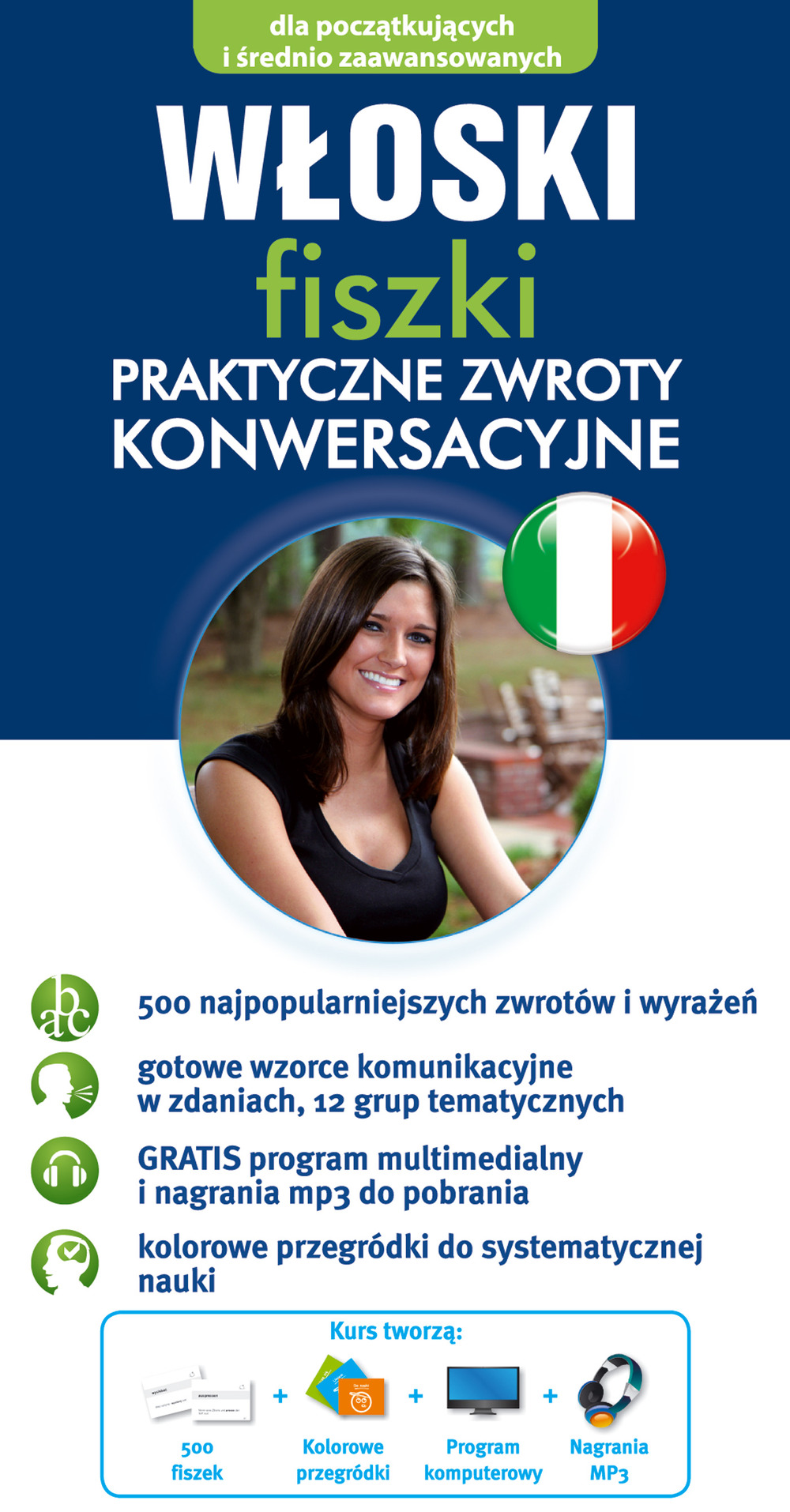 Włoski fiszki Praktyczne zwroty konwersacyjne to wyjątkowy zestaw 500 ponumerowanych fiszek oraz kolorowych przegródek. Uzupełnieniem zestawu jest program multimedialny oraz nagrania mp3 do pobrania. Nauka z kursem pozwala szybko i skutecznie opanować najczęściej używane w języku włoskim zwroty i...
