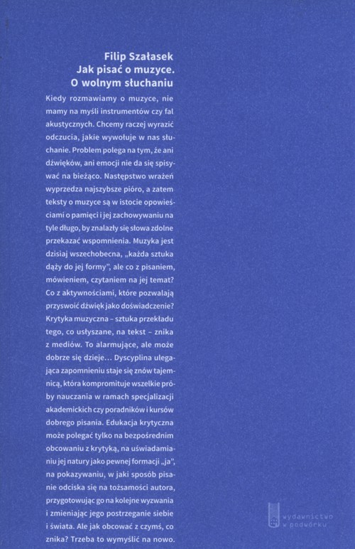 Zbiór esejów i rozmów o krytyce muzycznej i jej miejscu we współczesnej rzeczywistości medialnej. Autor powraca do źródeł słuchania, pyta: dlaczego w zetknięciu z muzyką czujemy potrzebę utrwalenia związanych z nią doznań? Czy jest to możliwe? Jak krytyka może wykorzystać odkrycia współczesnej...