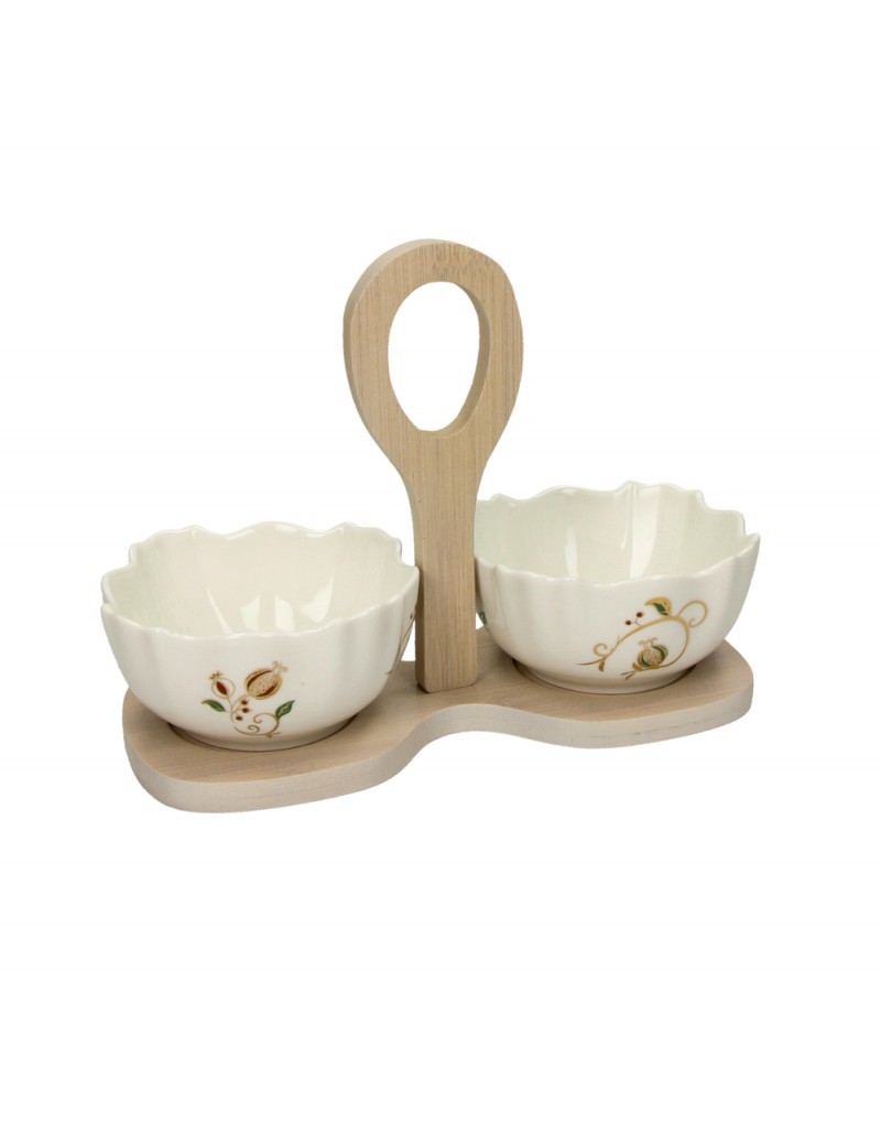 Bambusový stojánek se dvěmi miskami z porcelánu v bílé/červené/zlaté barvě s vánočním vzorem. Ozdobí váš slavnostní stůl na Vánoce.