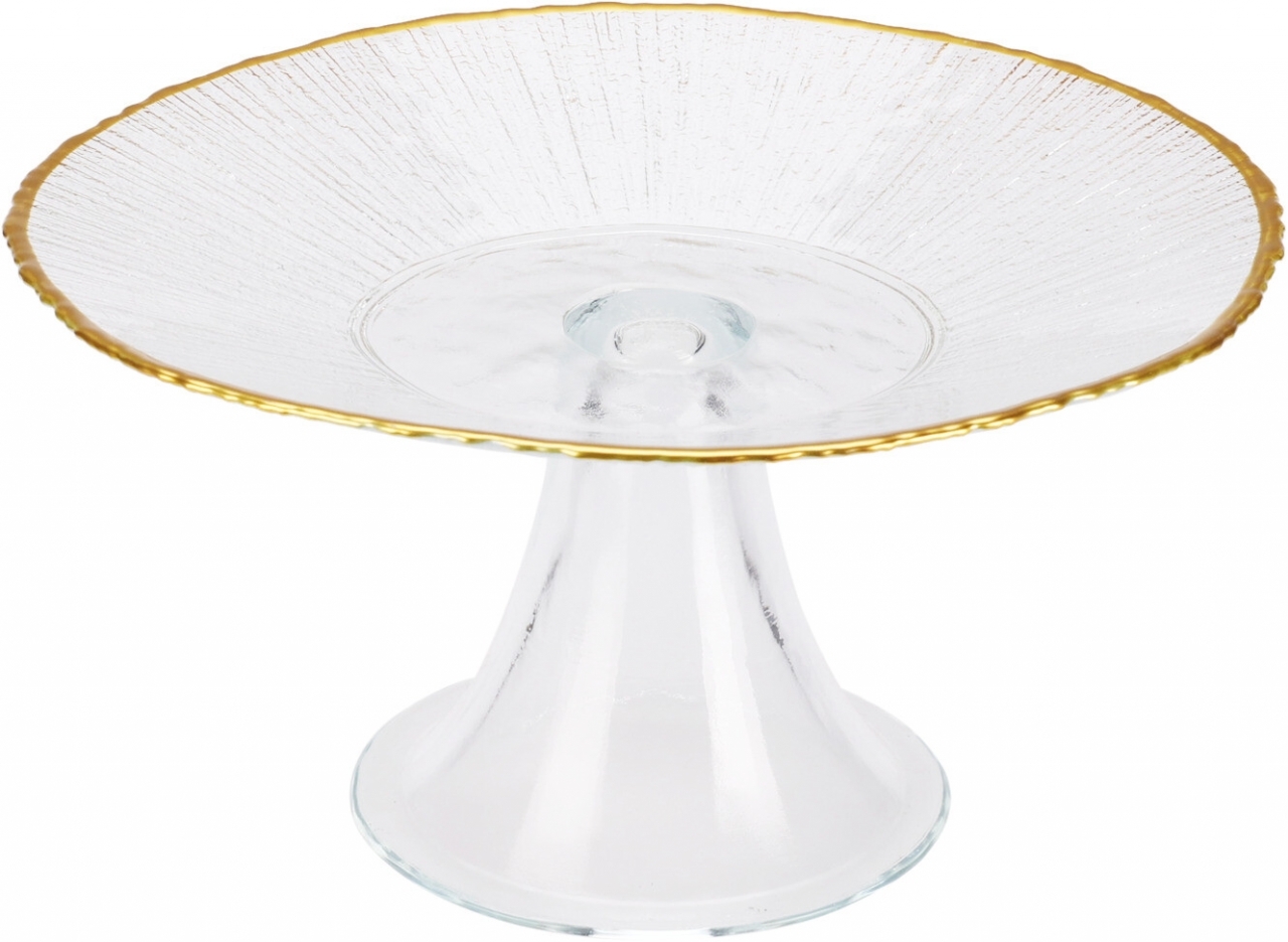 Servírovací podnos v čirém provedení ze zlatým okrajem. Můžete využít na dorty, zákusky nebo slané pohoštění pro vaše hosty.Rozměry:Průměr 21 cmVýška 9,5 cmHmotnost 450 g prečítať celé