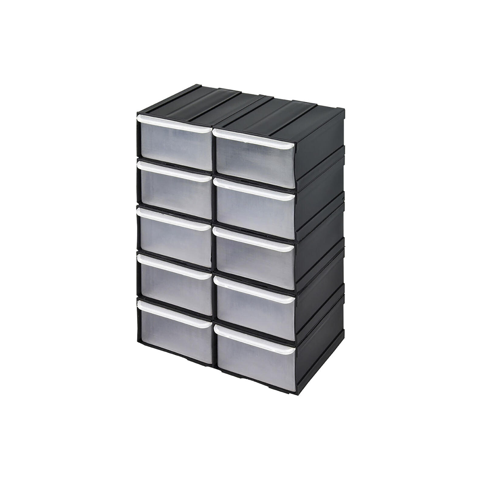 Organizér je vybavený desiatimi priehľadnými, vysúvacími zásuvkami, vďaka ktorým rýchlo nájdete potrebné súčiastky bez zbytočného hľadania. Jeho kompaktné rozmery (155 x 100 x 225 mm) umožňujú jednoduché umiestnenie aj v menších dielňach alebo pracovných kútikoch. Navyše je možné organizér jednoducho pripevniť na stenu, čím ušetríte miesto na pracovnom stole a zabezpečíte lepší poriadok.