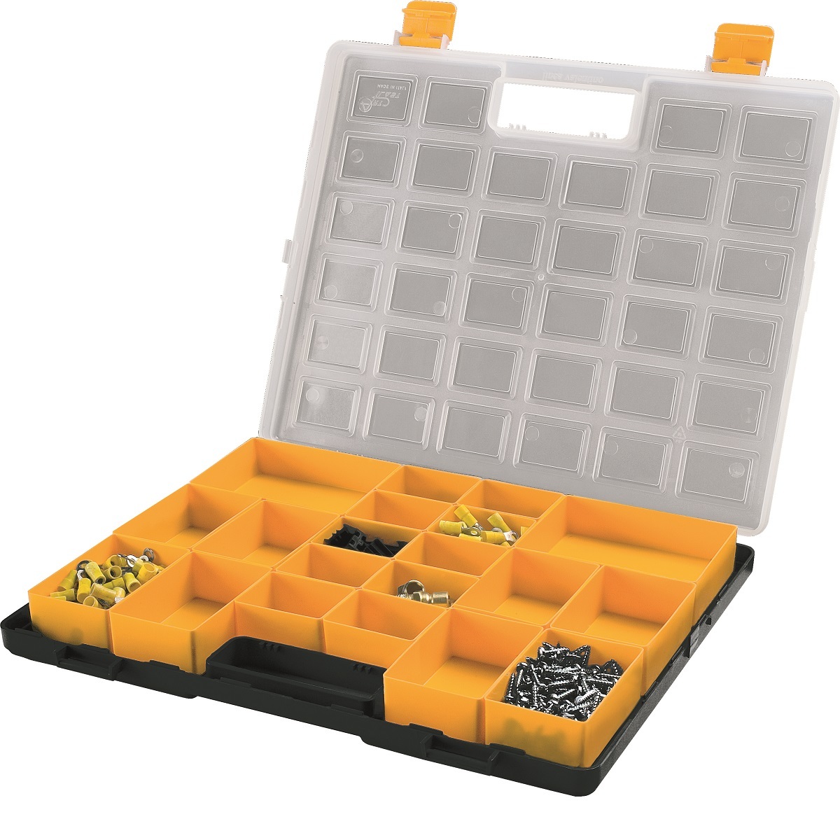 Plastový organizér s průhledným víkem, 3velikosti vyjímatelných boxů, rozměr 37,2 cm x 31,4 cm x 4 cm.Organizér s průhledným víkem a 20 boxy na nejrůznější předměty používané nejen v dílně, ale i domácnosti.Velikosti boxů10x vyjímatelný box ART187 (57x45x32mm)8x vyjímatelný box ART188... prečítať celé