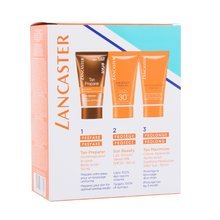 Lancaster Your Legendary Golden Tan tělový peeling Tan Preparer Body Scrub 50 ml + opalovací mléko Sun Beauty Sublime Tan Velvet Milk SPF 30 50 ml + krém po opalování Tan Maximizer Soothing Moisturizer After Sun 50 ml