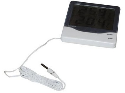 Digitální teploměr s čidlem pro měření venkovních i vnitřních teplot."