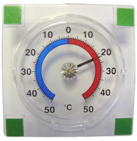 Mechanický venkovní teploměr s praktickou samolepkou pro nalepení, můžete ho přilepit kam jen potřebujete. Teploměr je základní pomůcka ke kontrole venkovní teploty. Teploměr má stupnici od - 50 do + 50 °C. Je vyroben z umělé hmoty v transparentním provedení. Materiál plast. Rozměry - 7,6 x 7,6 x 1,4 cm.