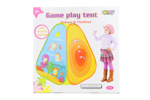 Hrací stan s aktivitami. Jednoduché rozložení. Z jedné strany má stan terč se suchým zipem a součástí jsou 3 míčky na házení. Z druhé strany jsou otvory pro házení míčků, součástí je 6 plastových míčku. Rozměry rozloženého stanu cca 95 x 95 x 100 cm. Rozměry balení cca 43 x 43 x 6 cm. Věk 3+