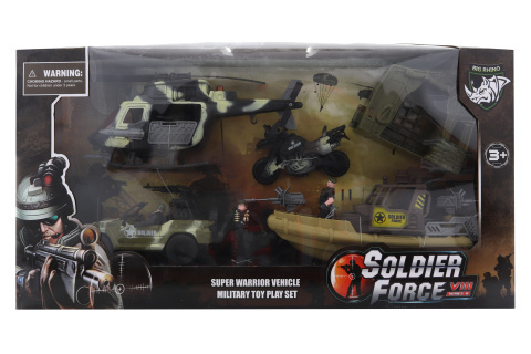 Velká vojenská sada obsahuje bunkr, člun, motorku, terénní auto, helikoptéru a 3 vojáčky. Rozměry balení cca 71,5 x 37,5 x 12 cm. Věk 3+ prečítať celé
